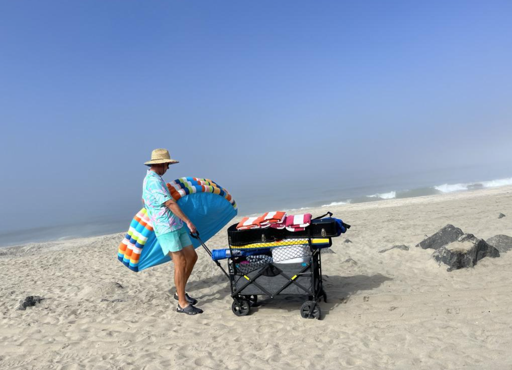 Spending time on the beach, observing people and their stuff, reminds me of this tendency. The way we approach going to beach is a good example of our attachment to stuff. Preparation to go down to the beach can be time-consuming and constitute a good deal of effort in the hauling to and from. The picture is taken this morning, real time; is the transporter missing anything?